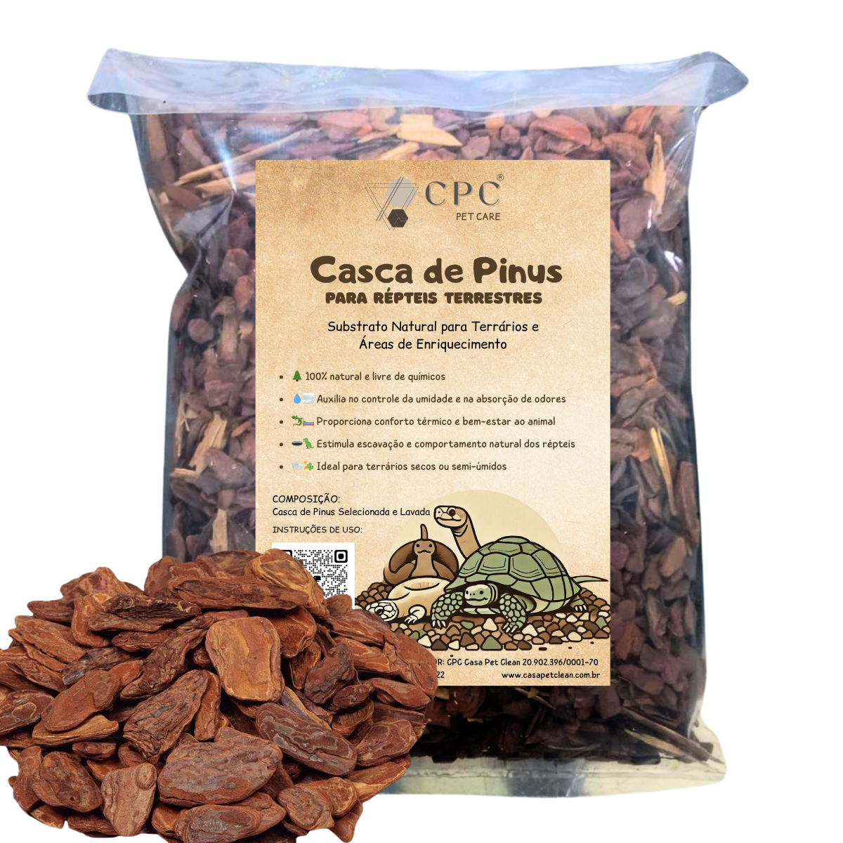 A Casca de Pinus Lavada CPC Pet Care é um substrato natural e funcional, ideal para a manutenção de terrários de répteis terrestres como jabutis, lagartos, iguanas e dragões-barbudos. Lavada e selecionada, possui granulometria controlada, baixa umidade e livre de poeiras e resinas, garantindo um ambiente seguro e saudável para o animal.