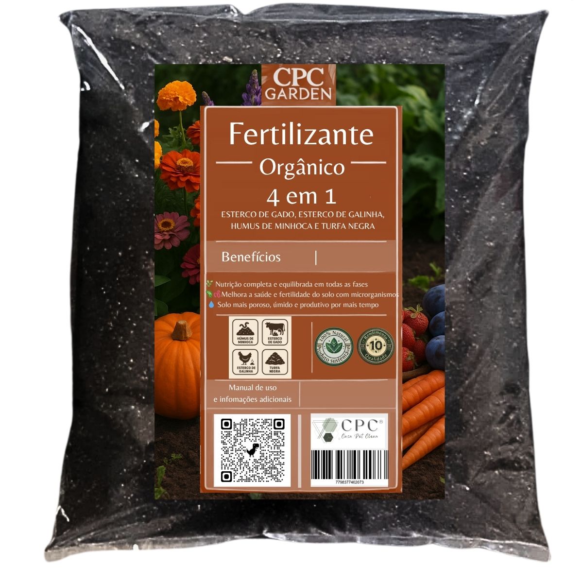 O Fertilizante Orgânico Premium 4 em 1 CPC Garden reúne em sua fórmula quatro fontes naturais altamente nutritivas: esterco de gado, esterco de galinha, húmus de minhoca e turfa negra. Essa combinação balanceada oferece uma adubação completa e de liberação gradual, garantindo desenvolvimento vigoroso, solo fértil e plantas resistentes.