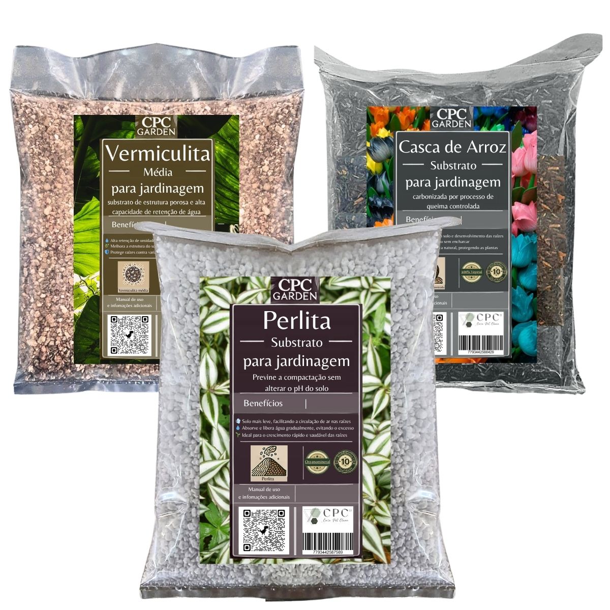 O Kit Substrato CPC Garden reúne três insumos essenciais para quem busca arejamento, leveza e equilíbrio hídrico no cultivo de plantas. Ideal para misturas personalizadas, hortas, vasos, mudas e jardins verticais, esse kit oferece uma solução prática e eficiente para otimizar o enraizamento, o crescimento e a saúde geral das plantas.